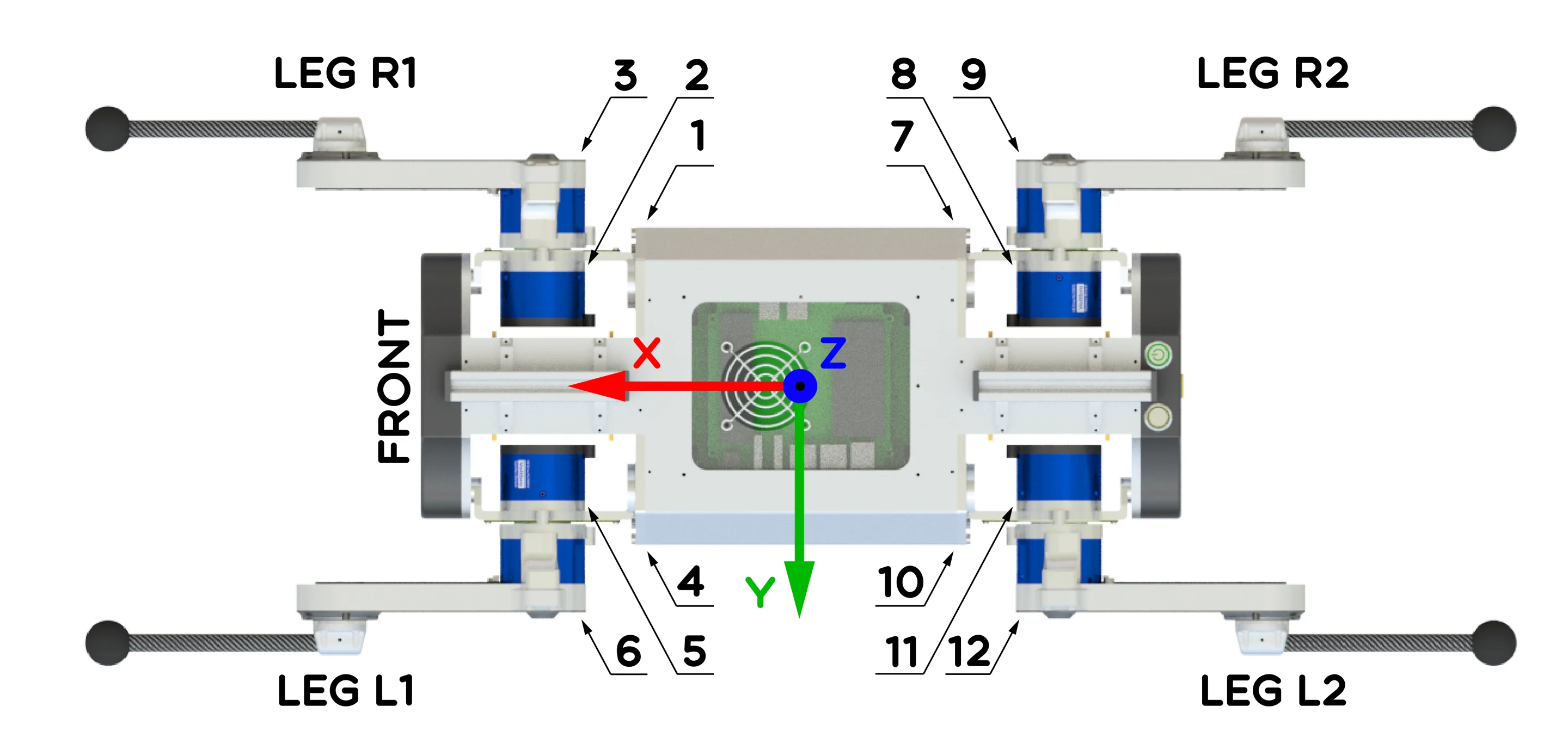 На рисунке показаны расположение базовой системы координат, наименование ног и нумерация электроприводов робота.