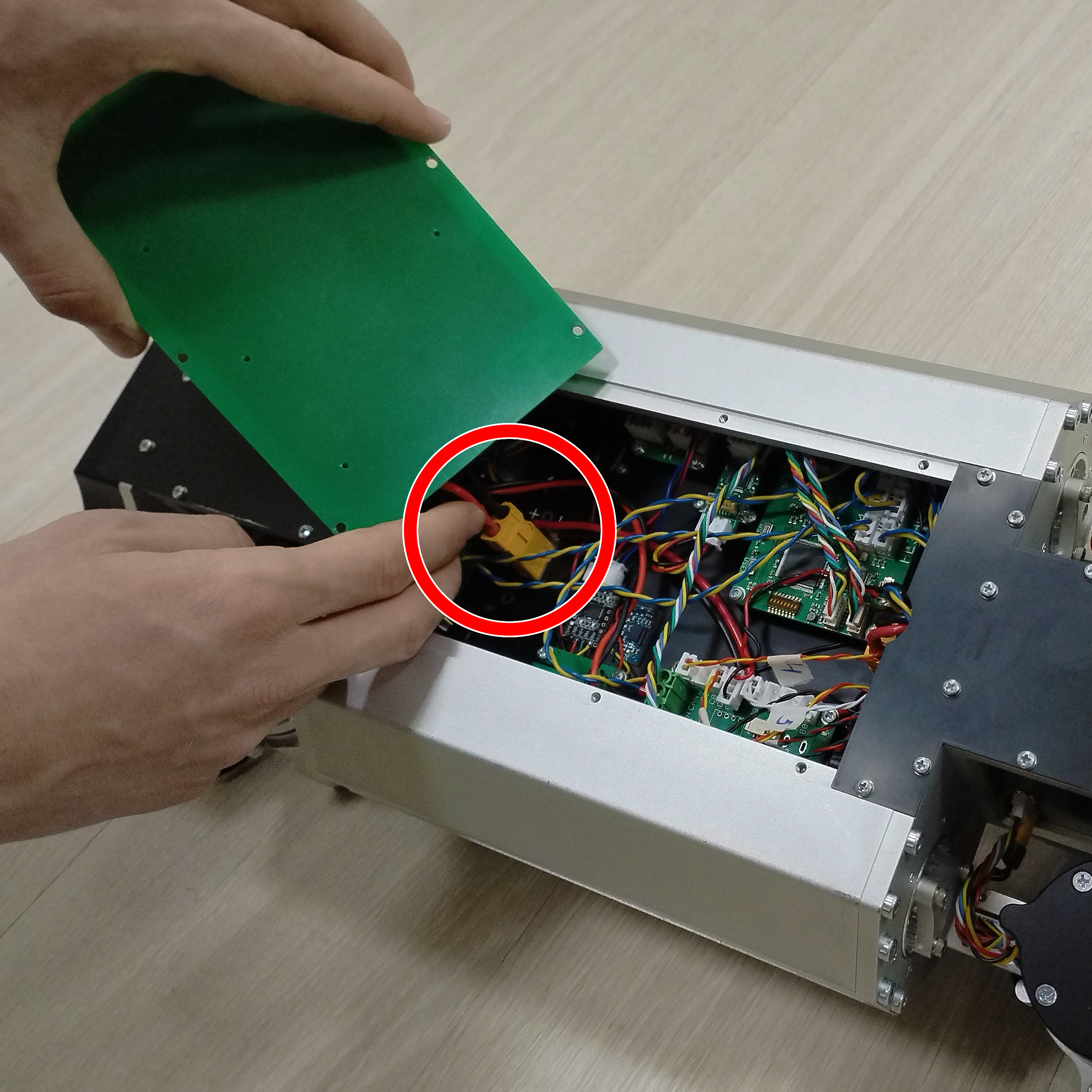 Переверните робота на спину (где расположены кнопки) и состыкуйте разъем XT90 аккумуляторного блока с разъемом питания робота: