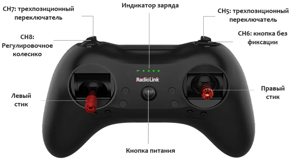 Управление роботом осуществляется с помощью джойстика Radiolink T8S. Перед использованием зарядите его с помощью кабеля microUSB.