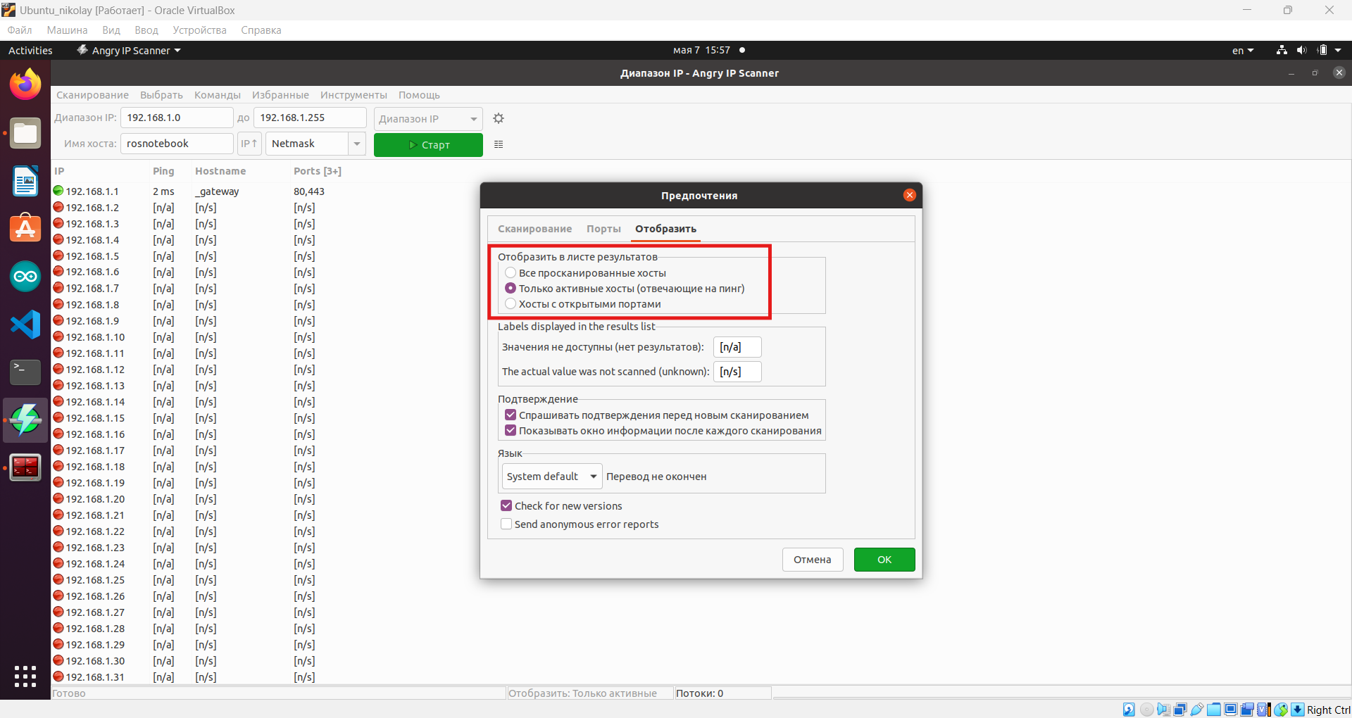- После сканирования вы увидете статистику. Чтобы показывать только активные хосты, выберите в меню Инструменты → Предпочтения ...→ Отобразить → Только активные хосты (отвечающие на пинг)