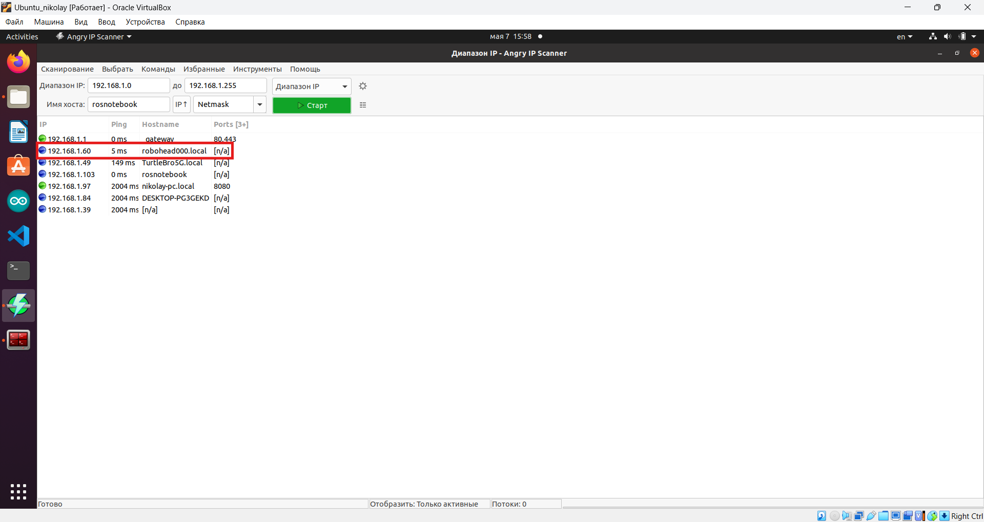 - Повторите сканирование. В случае, если компьютер и Робоголова подключены к одной Wi-FI сети, то вы должны увидеть IP-адрес Робоголовы: