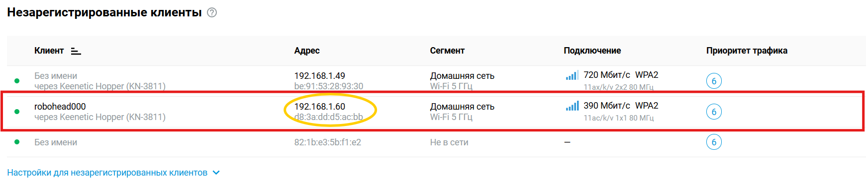 - Смотрим список устройств. Находим Робоголову и её IP-адрес