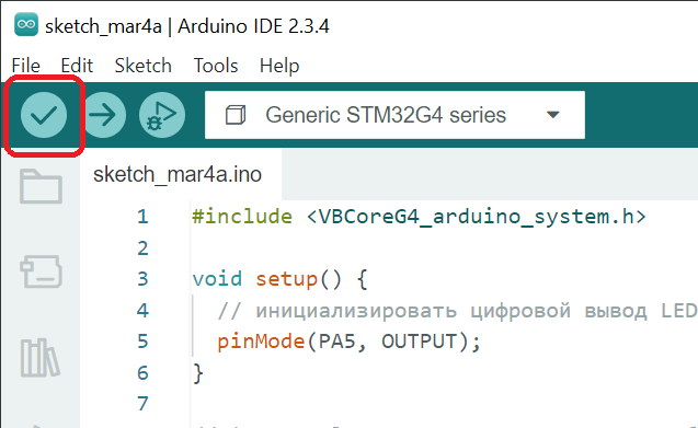 ReactionWheel_InvertedPendulum/Firmware/React_wheel_pendulum_practicum/React_wheel_pendulum_practicum.ino. - Скомпилируйте программу нажатием на кнопку с символом галочки в верхней части окна Arduino IDE: