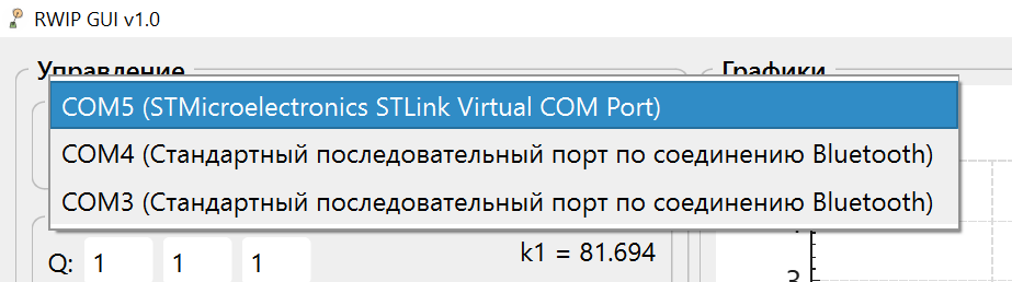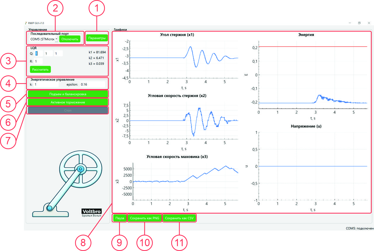 При успешном подключении становятся доступны все элементы управления, и на графиках начинают отображаться переменные состояния стенда.