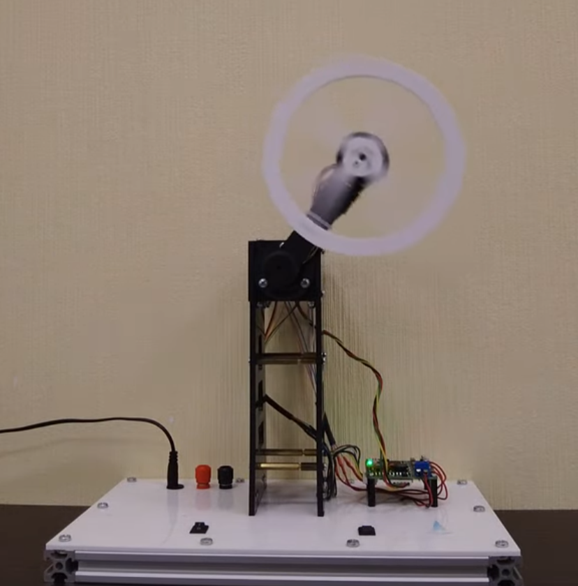 Конструкция стенда состоит из стержня и расположенного на нем инерционного маховика. Стержень свободно вращается и не приводится в движение напрямую. Маховик же приводится во вращение напрямую с помощью электродвигателя. Управление движением маятника осуществляется за счёт изменения направления и скорости вращения маховика.